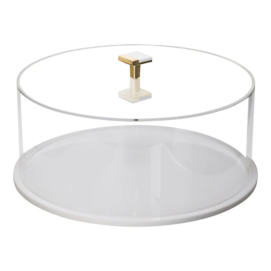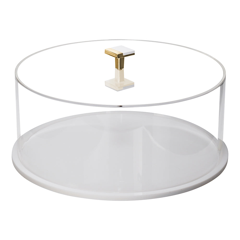 Cake domes are great centerpieces! Enhance the display of your delicacies while ensuring the cake stays fresh, covered and oh-so tempting. Created of high quality and thick lucite, this cake box is a winner. White tray and elegant gold handle lends a modern element to this most popular gift item. Dimensions: 12.5" (W) x 5 1/5" (H)