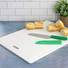 Be a pro chef with this Martha Stewart Everyday 18x13 in. Plastic Cutting Board in Blue. The heavy duty surface is durable and resists stains, yet gentle enough for your knives. A reversible design means both sides can be used to help prevent food contamination. The plastic material washes off easily and it's dishwasher safe for even faster cleanup.