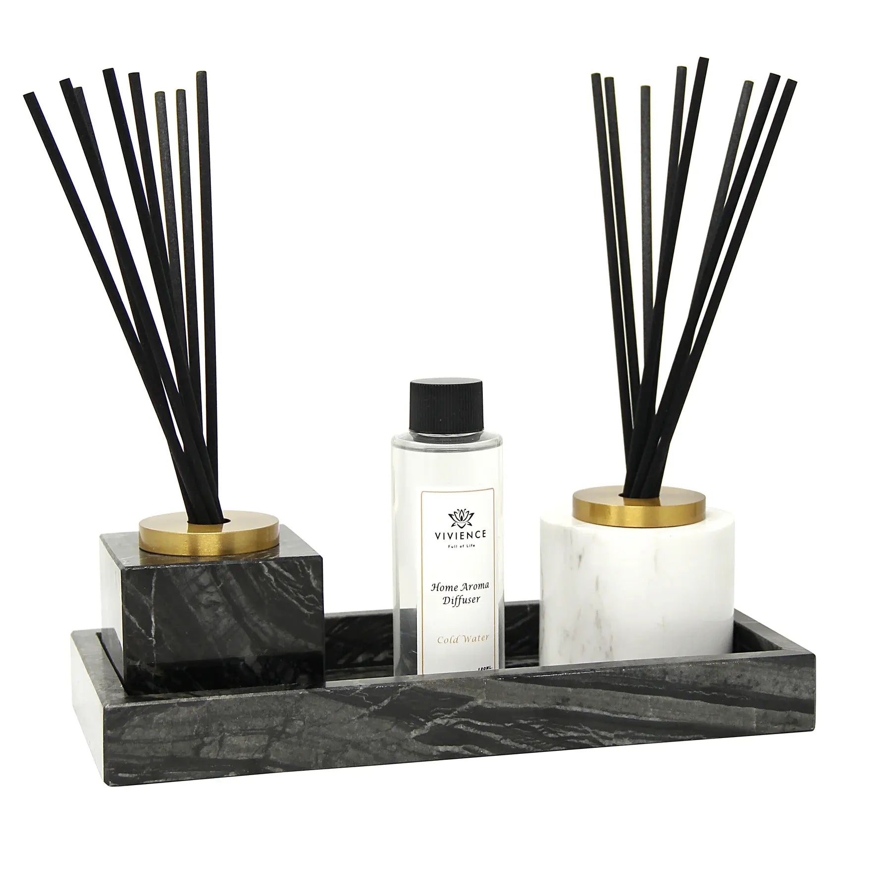 Round marble diffuser, adorned with a dimensional gold lid. Its fresh scent brightens your day and refreshes your space. Ideal for vanity or room decor, infusing fragrance elegantly.