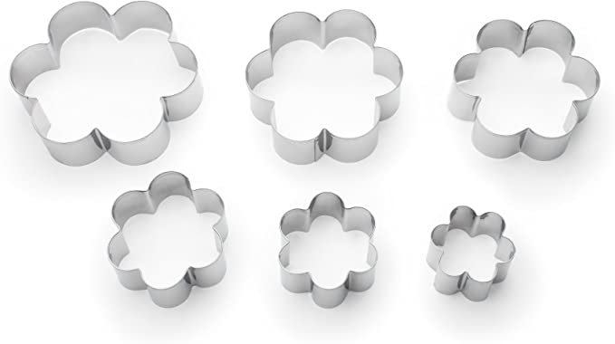 Create fun-to-decorate cookies with this flower cookie cutter set! This set includes six flower shaped cutters, conveniently featured in a handy storage tin. These shapes will slice through and release from dough easily, bringing ease to the cookie prep process. Constructed of sturdy stainless steel, these cutters have an attractive shine and luster that will be best preserved when hand washed and dried completely after use. Great for cookies, fondant, crafts and more!