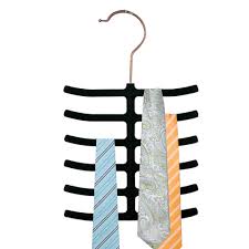 The tie rack offers 6 slip-resistant tiers, organizing up to 6 ties at once, with additional hooks to store a belt or two. Equipped with a swiveling hook, the hanger spins in a full circle so you can see all the belts and ties in one quick glance and pick out the one you want to wear for the day. MATERIAL: Steel. COLOR: Black