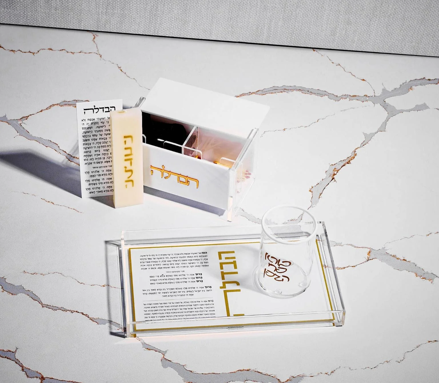 This stunning Lucite Havdalah Plate will make a striking addition to your Havdalah table. Features clear lucite sides, and white lucite on bottom, and a gold metallic print. Both practical and beautiful, this Havdalah plate would make a great gift