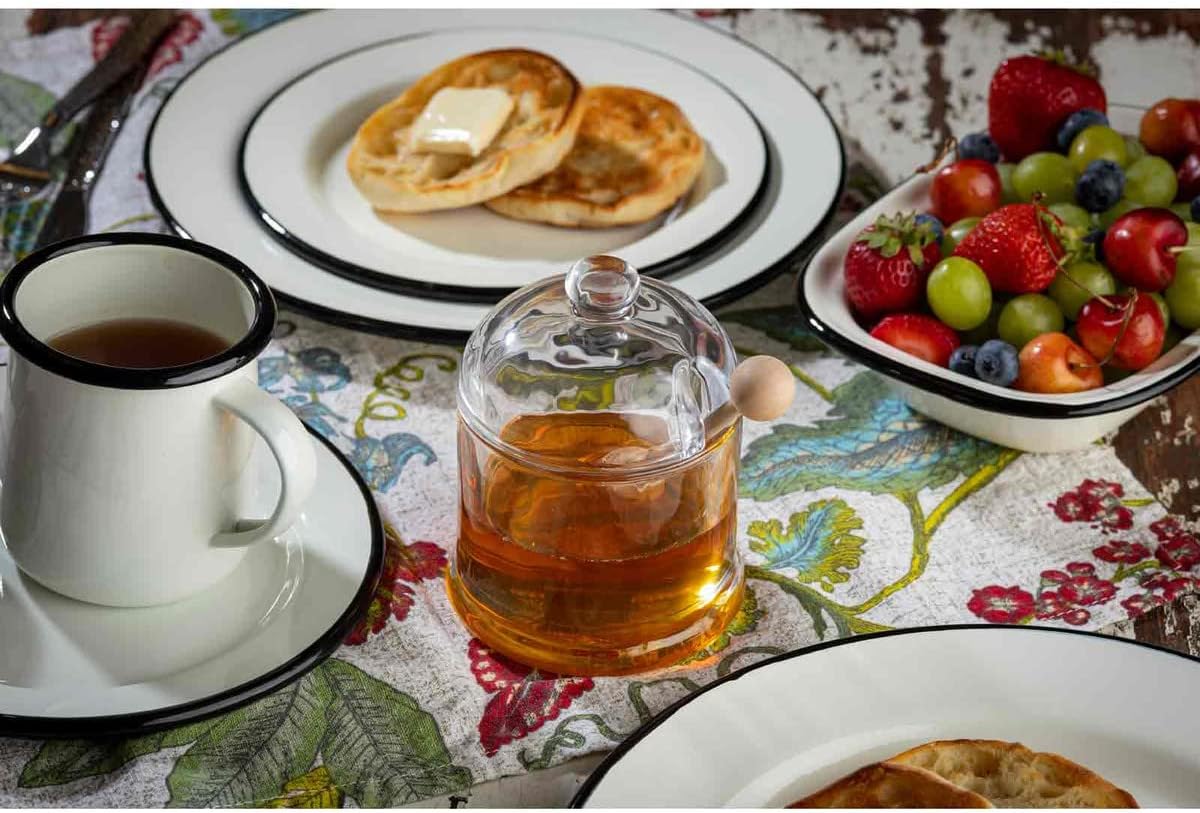 Store up to 8¼ oz honey on the table or counter top in this elegant glass jar, then simply dunk the dipper into the honey (or other syrup), then slowly twirl the handle between the thumb and fingers while in transport to prevent dripping on the table
