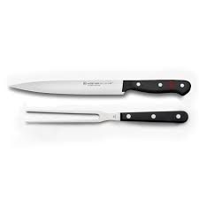 The Wusthof Gourmet 2-Piece Carving Set includes the Wusthof Classic Straight Meat Fork and Wusthof Gourmet Carving Knife. This set is ideal for carving and slicing meat and poultry. The fork holds food steady, while the knife slices easily with a single stroke. This set comes in a convenient storage box.The Wusthof Gourmet collection features stamped blades precisely cut with state-of-the-art laser technology for quality cutlery at a great value. The blade is laser-cut and stamped from X50CrMoV15 steel, which is a high-carbon stainless steel that includes vanadium for durability and wear resistance, and molybdenum for hardness and corrosion resistance. The triple-riveted handles are made from a highly durable synthetic that resists fading and discoloration.