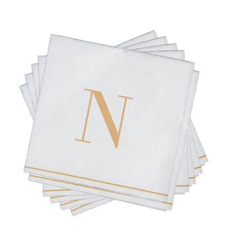 16 PK White and Gold Cocktail Paper Napkins - Letter N