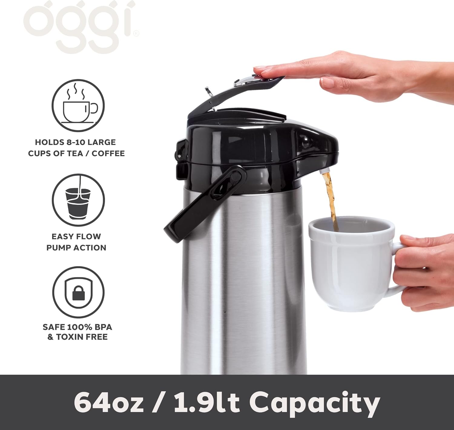 Did someone say coffee? OGGI's Pumpmaster 64oz Stainless Steel Carafe is a go-to when multiple servings of beverages are needed. It is a stylish and sleek way to serve coffee for a buffet or dinner party at the end of a long week. With double-walled vacuum insulation, its glass liner keeps beverages hotter longer with excellent temperature retention as well as maintaining the freshness of a brewed pot of coffee or other hot beverages. Keeps contents hot for a minimum of 6-8 hours. It should not be limited to just coffee, prepare hot chocolate for the kids on a cold night or keep water hot to refill your cup of tea. This drink server utilizes a pump system to dispense both hot and cold beverages. With a thermal glass vacuum liner, excellent temperature retention is achieved for hours. The lever-action pump makes filling cups so easy. This Pumpmaster has four available beverage settings to choose from: REGULAR - DECAF - MILK – WATER. Best of all, the carry handle makes this server an easy take along to sporting events, picnics, social gatherings, and more. Wash by hand or fill with ice cubes easily with the wide mouth opening. To ensure the highest quality possible it is recommended that you hand wash this product.