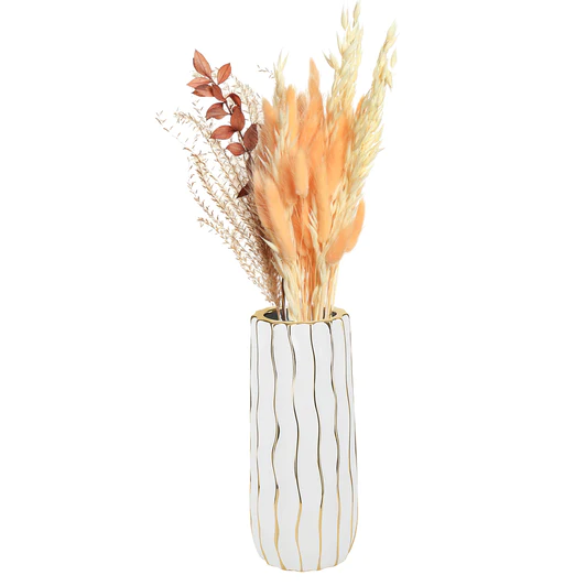 This beautiful porcelain vase features a luxurious white finish complemented by a stylish gold wavy design. Perfect for adding a classy, sophisticated look to any home. The off-white porcelain and eye-catching gold wave design create a timeless piece adding a unique touch to any living space / table decor. Great gift idea. Dimensions: Small: 5.12" x 11.8"