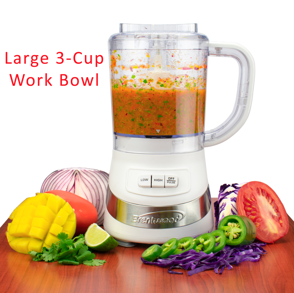 Our 200w Brentwood FP-549BK 3 Cup Food Processor saves you time and energy in the kitchen. It’s perfect for creating dips, salsas, chopping veggies, spices and more. Easy to use high/low 2 speed operation. Sharp, durable stainless steel blades mince foods in seconds. Safety lock lid prevents accidents. Compact design takes up little counter space and is easy to store. BPA Free and dishwasher safe removable parts.
