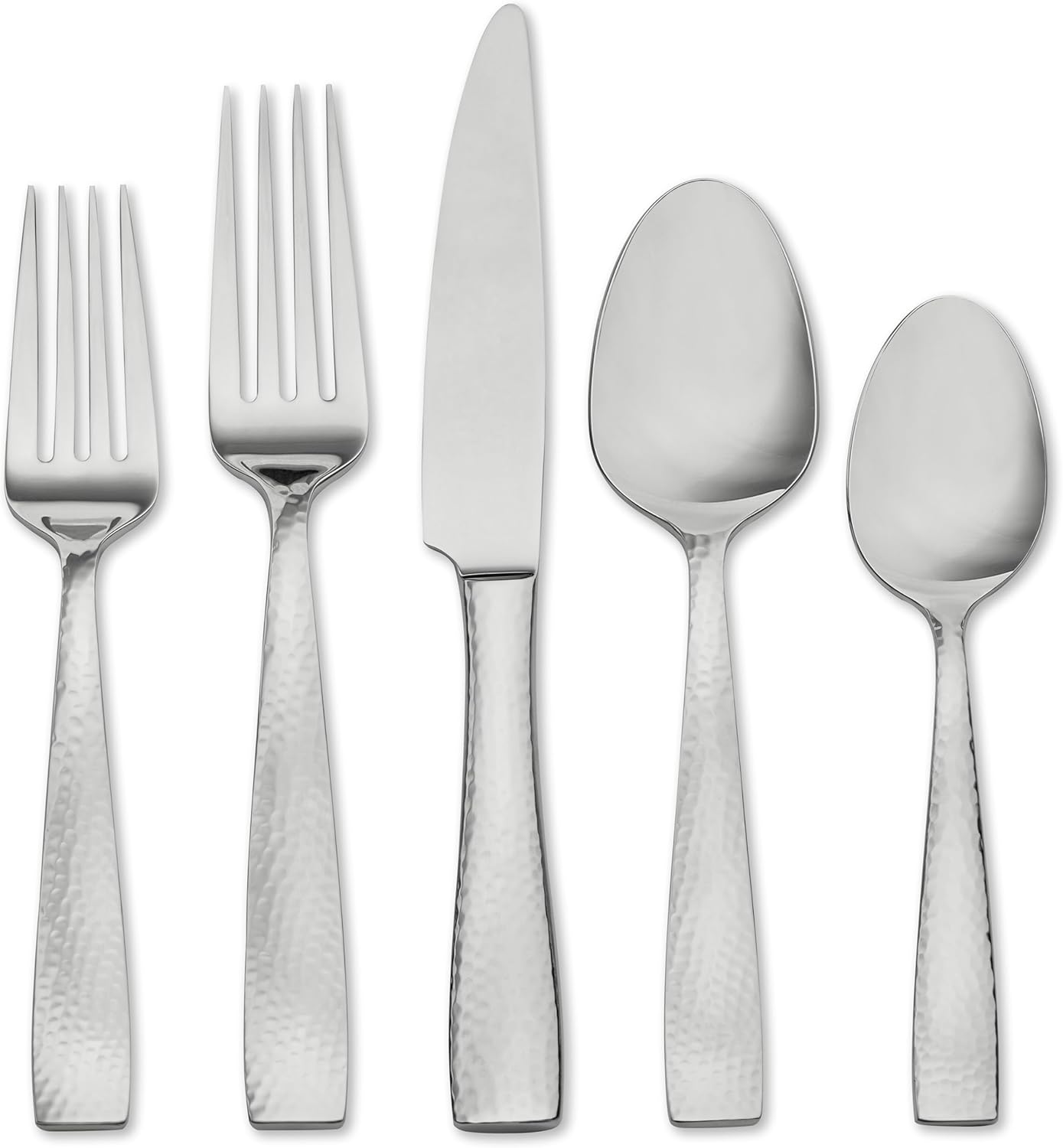 Make a statement as you set the table with the Vento Hammered Flatware Set by Hampton Signatureö. With the look and feel of the finest hand-hammered metal, Vento features a unique textured handle that gives it a ruggedly metropolitan appeal. Crafted of versatile stainless steel with a slightly tapering bodice, itÏs ideal for both everyday use and formal occasions alike and promises to be one of the highlights on your tableto