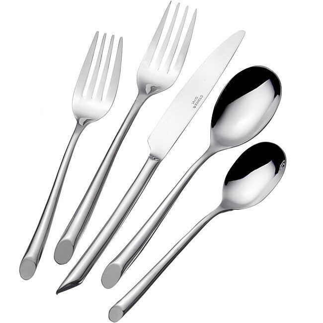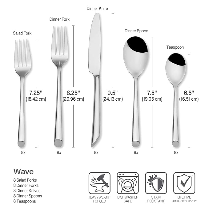 Add a touch of contemporary style to your everyday home dining with this 20-piece Wave flatware set from Towle, which is crafted from premium stainless steel. This set provides full service for 4 diners, and each 5-piece setting consists of a dinner fork, a salad fork, a dinner spoon, a teaspoon, and a knife. Ideal for both everyday or formal dining, the nicely weighted Wave flatware pattern is distinguished by rounded shafts that flare toward the bottom and feature a smooth, slanted end. They also offer a mirrored finish for the perfect dining accent. Dishwasher safe.What's in the Box4 place settings. Each place setting consists of: dinner fork; salad fork; dinner spoon; teaspoon; knife. 20 pieces total.